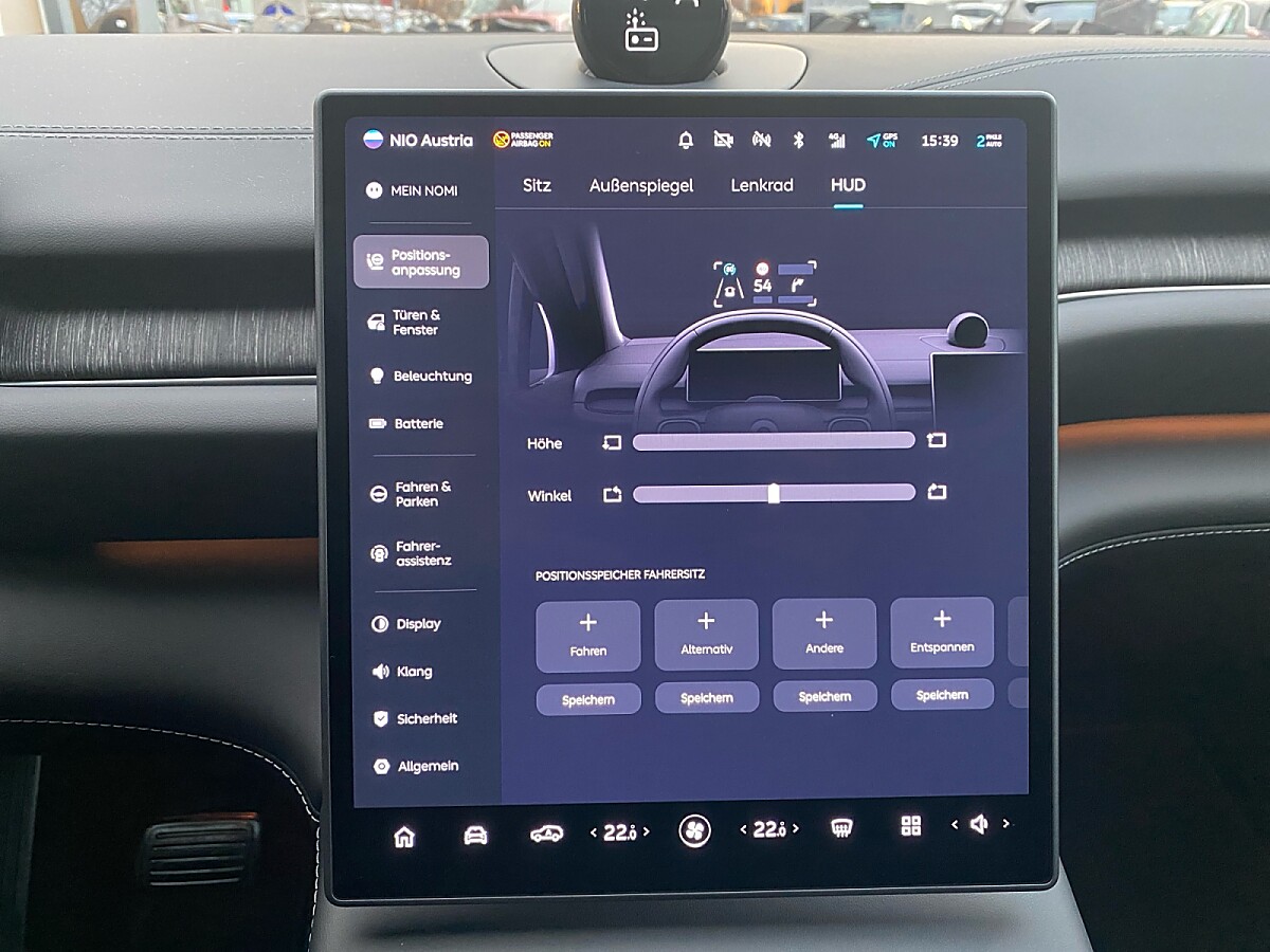 Das zentrale 12,8-Zoll-AMOLED-Display sorgt für brillante Darstellung, während das NOMI Halo Sprachassistenzsystem alle NIO-spezifischen Funktionen integriert. Sportlich gestaltete Sitze mit optionaler Heizung, Belüftung und Massagefunktion bieten höchsten Komfort. Das immersive 7.1.4-Soundsystem mit 23 Lautsprechern und das Ambient Light mit frei wählbaren Farbkombinationen schaffen ein Ambiente der Spitzenklasse.
